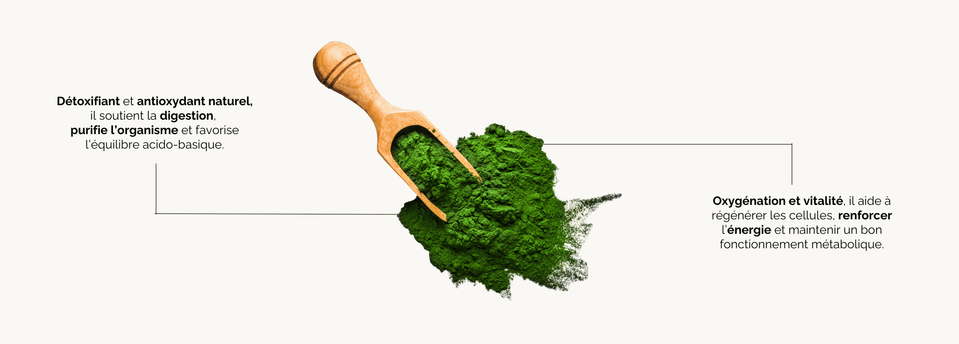 Riche en antioxydants, la chlorophylle aide à neutraliser les radicaux libres responsables du stress oxydatif. Elle participe ainsi à la protection des cellules et au ralentissement du vieillissement prématuré. Grâce à son action détoxifiante, elle contribue à purifier le foie et à soutenir les processus naturels d’élimination.