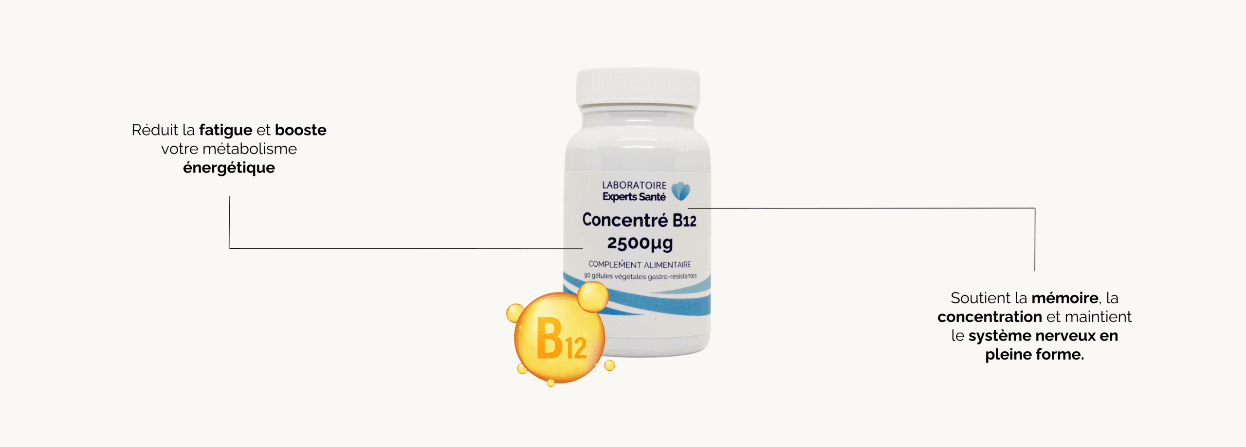 Notre Concentré B12 est un allié précieux contre la fatigue. Une formule hautement dosée (2500 μg par gélule) pour un regain d’énergie immédiat, une meilleure concentration et un soutien optimal du système nerveux pour une vitalité retrouvée jour après jour.
