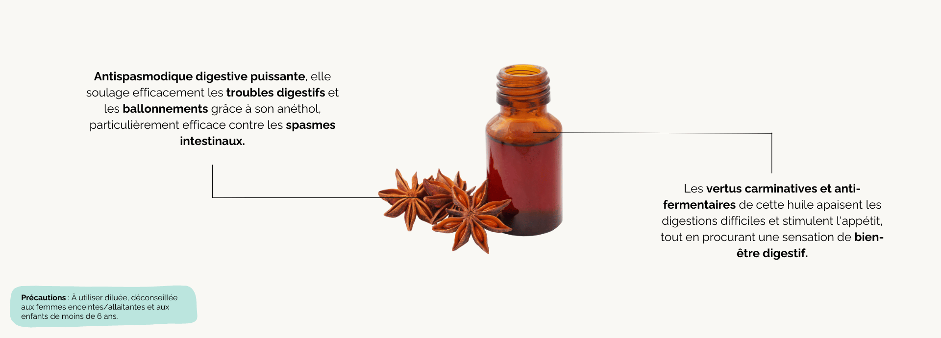 Déconseillée aux femmes enceintes ou allaitantes, aux enfants de moins de 6 ans et aux personnes souffrant d’antécédents de cancers hormono-dépendants. Ne pas utiliser en cas d’allergie connue à l’anéthole. Demander conseil à un professionnel de santé. Faire un test cutané avant la première utilisation. Éviter le contact avec les yeux et les muqueuses. Ne pas ingérer sans avis d’un professionnel de santé<