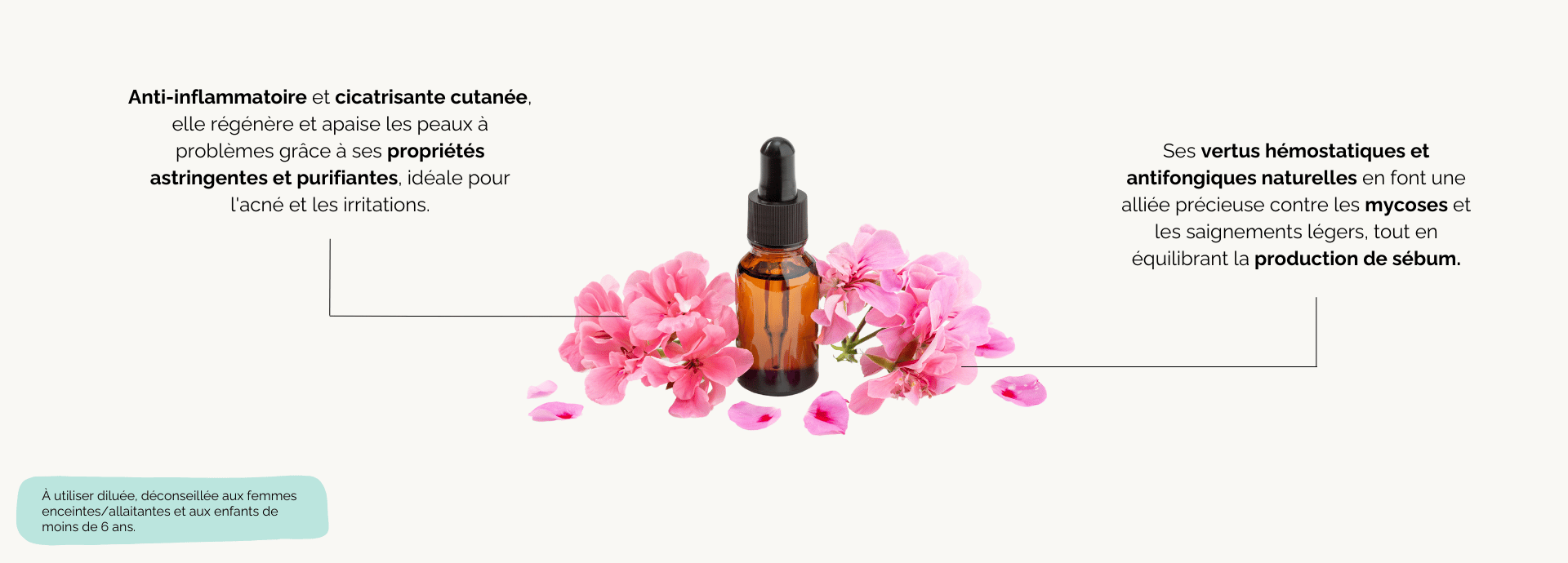 Précautions : Ne pas utiliser chez les enfants de moins de 3 ans ni chez les femmes enceintes ou allaitantes. Toujours demander l’avis d’un professionnel de santé avant usage oral ou cutané. Faire un test dans le pli du coude avant toute application.