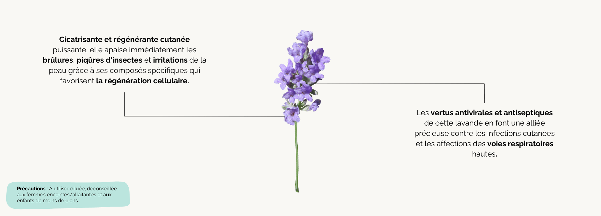 Cette composition spécifique rend la Lavande aspic particulièrement efficace pour les soins cutanés, les douleurs et les troubles respiratoires.