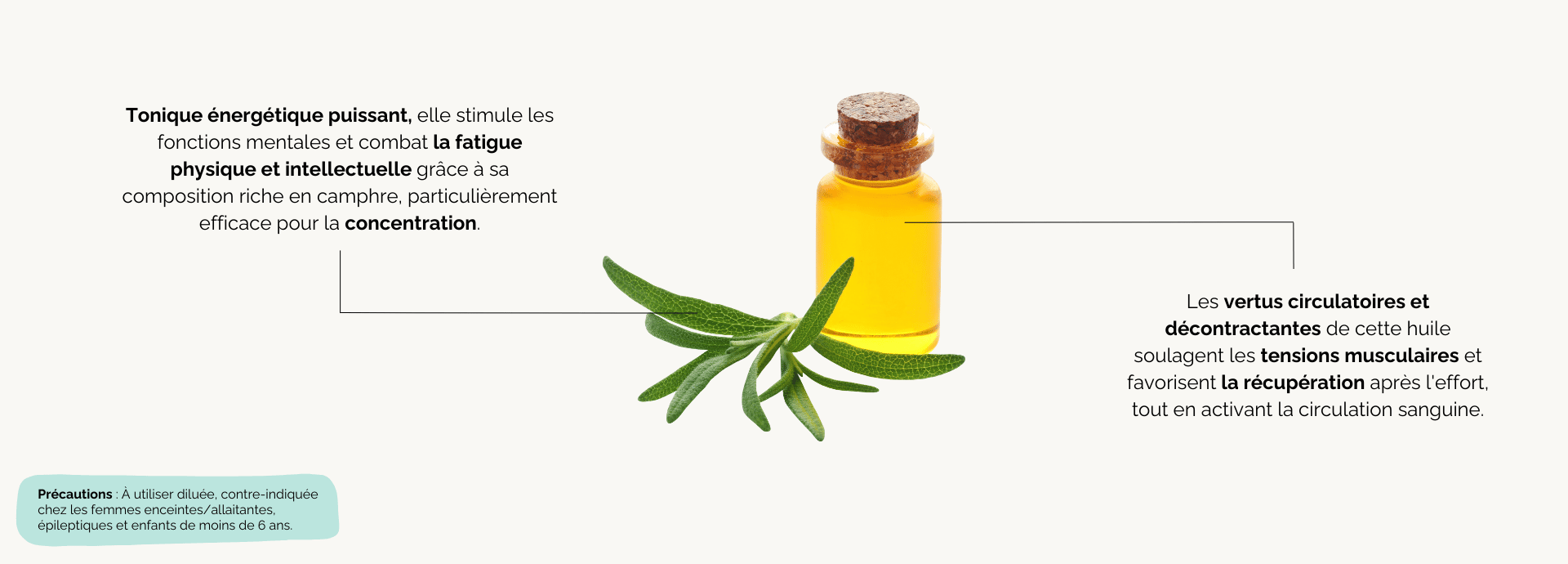 L’huile essentielle de Romarin officinal à camphre (Rosmarinus officinalis ct. camphre) est particulièrement appréciée en aromathérapie pour son action tonifiante sur l’organisme. Issue de la distillation des sommités fleuries de la plante, elle se distingue par sa teneur élevée en camphre, lui conférant des propriétés stimulantes puissantes. Elle soutient efficacement le système nerveux et aide à combattre la fatigue mentale, tout en améliorant la concentration et la mémoire. Elle est ainsi précieuse en période de surcharge intellectuelle ou d’examens.