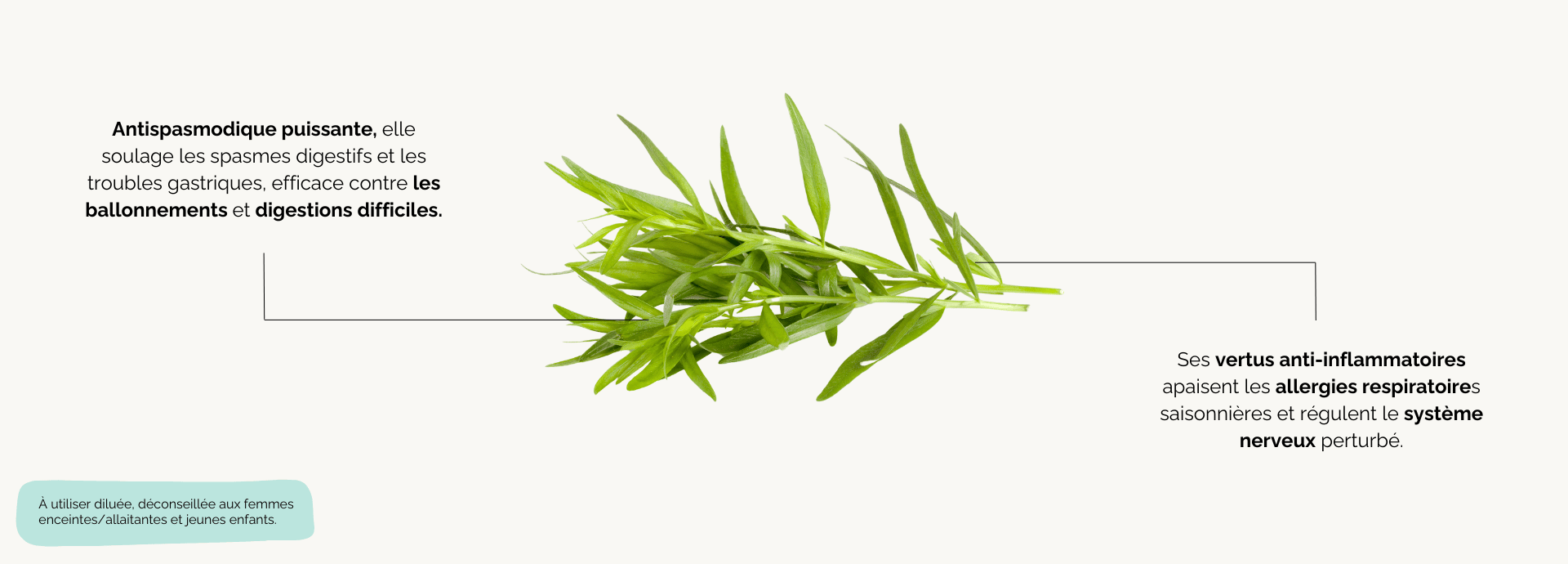 La richesse en méthyl-chavicol fait de l’huile essentielle d’Estragon un excellent allié pour apaiser les spasmes digestifs, les tensions musculaires et les réactions allergiques d’origine nerveuse.