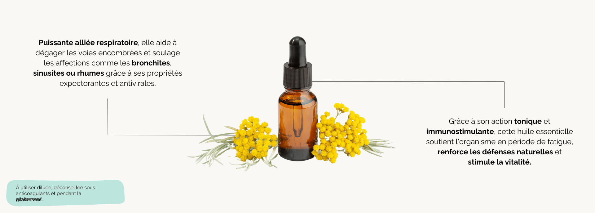 Aromatique et camphrée : Contrairement à l’hélichryse italienne (H. italicum), plus florale, l’hélichryse à capitules possède une odeur fraîche et pénétrante, proche de celle de l’eucalyptus. Cette singularité est due à sa forte teneur en 1,8-cinéole (eucalyptol), un composé aromatique aux propriétés expectorantes bien connues.