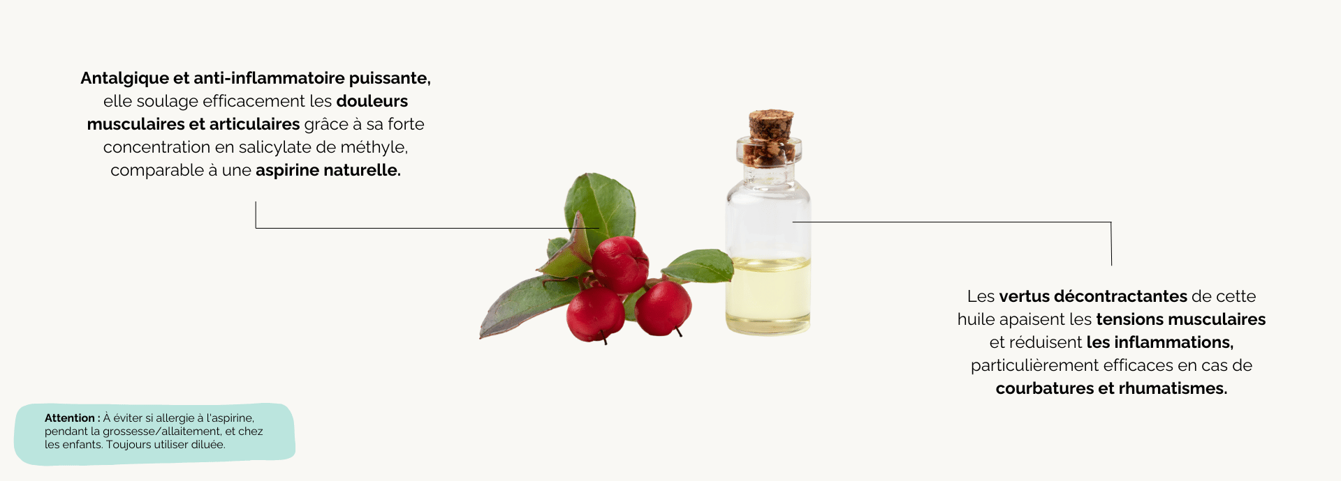 Puissante par nature, cette huile essentielle doit être utilisée avec précaution : elle est déconseillée aux femmes enceintes ou allaitantes, aux enfants et aux personnes allergiques à l’aspirine ou sous traitement anticoagulant. Toujours diluer dans une huile végétale avant application et demander conseil à un professionnel de santé en cas d’usage prolongé.