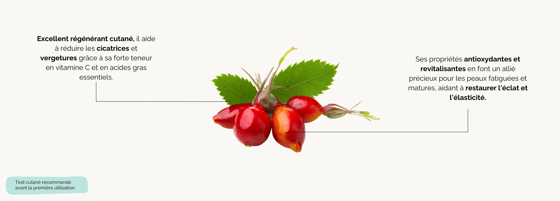 • Ses propriétés antioxydantes et revitalisantes en font un allié précieux pour les peaux fatiguées et matures, il aide à restaurer l’éclat et l’élasticité et aide à réduire les cicatrices et vergetures grâce à sa forte teneur en vitamine C et en acides gras essentiels