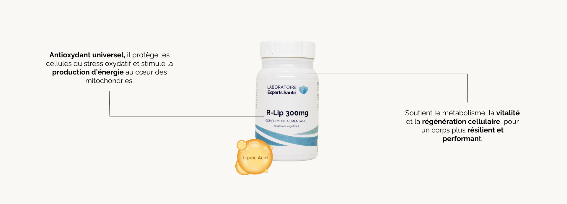 – Forme active et stabilisée (R-Lipoïque Sodium Salt)